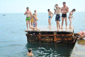 Пустой пляж, вход в воду: с лестнички сразу мелко, надо падать на пузо и тогда проще ползти =). Есть вход в воду с пирса, там сразу глубоко. И с того же пирса можно зайти как то по сетке, я не поняла, как, но друзья сказали, что удобно. Пляж оборудован лежаками и навесами. Есть небольшой магазинчик, в котором точно есть кола и минералка. Там же варят отличный капучино. До нормального магазина надо ехать в Новомихайловку. Или идти по пляжу, друзья ходили, говорят минут 15-20.
