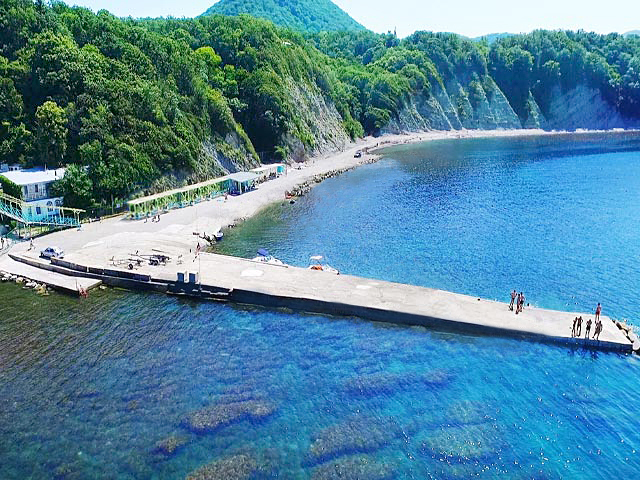 Пляж имеет площадь 300 кв. метров, оборудован теневыми навесами, раздевалками, душем.